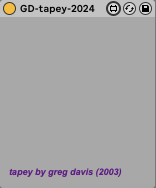 | Description: | gd-tapey is a Max For Live device that I originally created in the Max/MSP Pluggo environment in 2003 & updated for M4L in 2024. This is a kind of auto-warble / tape effect. It uses the incoming audio to trigger shifting delay lines and feedback creating a warbley tape like effect. |