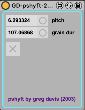 Description: gd-pshyft is a Max For Live device that I originally created in the Max/MSP Pluggo environment around 2003 & updated for M4L in 2024. This is a crude pitch shifting effect, there are controls for pitch and grain duration. Randomize buttons for both of those parameters as well as a toggle for “freak out” mode. This loads with random values for fun, surprising sounds.