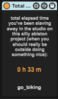 | Description: | track the time u spent toiling away on ur nxt ambient banger. with useful random notes like "eat a salad" or "do some stretches". note: this device creates an undo point by recording the time every 60 seconds, so when you save then restart your project it will retain the last minute. comes in audio and midi variants woohoo. credits: mostly borrowed code from here: https://maxforlive.com/library/device/8411/project-timer - although the problem with that one is that it stops working after a few minutes if the transport is not playing. i spend a lot of time patching in cardinal vcv plugin with the transport off, doing generative self running nonsense. so i needed something that just kept working as long as ableton is open. also i should mention: this other device by tomcosm is also a great freebie for tracking project stats: https://maxforlive.com/library/device/5337/track-stats-lite |