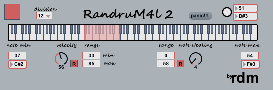 | Description: | Randrum sends random midi notes to any midi device inside live. You can control the note range and velocity range, if "random velocitiy" is turned on. You can also set the note divison. Bpm is synced to your current Live Set. * This works great with glichty percussions. ** If you want to use it with harmonic instruments, add Live's "Scale" Midi effect and every note will play in tune. This thing is pretty simple, i hope you still like it. Have Fun. Update v. 1.1 *replaced floats with live.numboxes so they can be automated and saved as presets. * start and stop toggle is now synced with lives transport. Update v. 2.0 * you can now (optional) select the range while dragging your mouse over the keyboard * beside midi numbers you can now also see what midi notes (C-1) you are choosing, to get a better visual feedback. * EVERY parameter, even toggles, are replaced with live.objects, so you can automate every parameter now. * "note-stealing" was added. set the amount of stealing (notes not coming through to live) or randomize. |
