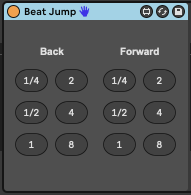 | Description: | This device allows you to jump forward/backward by a given number of beats while Live is playing. |