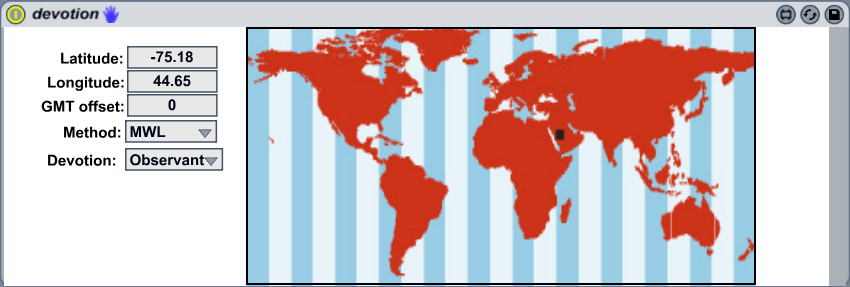 | Description: | Insert on master fader channel and it adjusts master audio output level for the call to prayer 5 times per day according to geographic location and devotion level. Instructional Video: http://youtu.be/jBc6CziDYJI You can also download all 7 Sufi Plug Ins from our website, in the form of an ALP (Ableton Live Project) demo song. http://www.beyond-digital.org/sufiplugins/download/ |