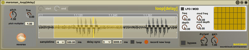 Description: It's a live looping and pitchshifting plugin. The loop can be reversed, pitched and modulated by two sinewaves which can result in frequency modulated granular screeches of subtle stutter effects. The audiobuffer can be constantly refreshed or locked. Bufferlength in sync with BPM or choose milliseconds. Also you can scroll through the buffer with your mouse or of course through plain and simple automation.