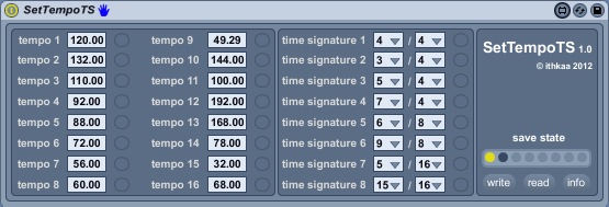 | Description: | SetTempoTS allows you to preset different tempi and time signatures (if) needed throughout one and the same live set. To save your preset, cmd/ctrl- shift-click on one of the slots in the preset object. The settings saved in the first slot will be auto-loaded the next time you open your session/drop the device on a track. All number boxes and buttons are MIDI/key-mappable. |