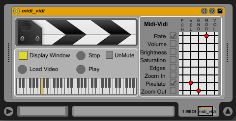 | Description: | Midi-Vidi allows you to control the playback of Quicktime videos with Midi inside of Ableton Live thanks to the magic of Max for Live. Midi-Vidi divides your video into 12 equal parts based on the length of your video and assigns those parts to Midi notes. There is also an effects section that allows you to map attributes such as velocity to some simple effects. Midi-Vidi is based entirely on Cycling 74's Jitter tutorial #26 with only minor modifications by me. I can't take any credit for it's construction. I hope to use this as a jumping off point and make further modifications in the future to allow for more playability. enjoy. |