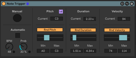 Description: Trigger the manual button to set off a single note or you can use the automatic to trigger on each beat of the independent device metronome. Automatic also has a probability dial to make that more random.