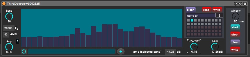 | Description: | Third Degree imposes a 30-band, third-octave filter complex upon all incoming audio and also doubles as a third-octave band spectral analyzer. It was originally designed for use in research projects within our university lab research as a rapid way to derive spectral envelope shapes from natural sound sources and then apply them to other material. Like all our plug-ins, the device also has been conceived with musicians in mind. Band center frequencies range from 25 Hz to 20 kHz. Amplitudes can be assigned to a single band or all bands simultaneously, and can be assigned via MIDI, manual entry, text entry, or quickly via mouse-click directly on the filter display. Average results from spectral analyses can be sent directly to the filters for immediate use, and results from each adjacent time window can be saved to a file. There also is automatic gain compensation for signal loss due to the filtering, and the relative proportion of filtered and unfiltered versions of the signal can be determined using a dry/wet control. Relevant MIDI parameters have been mapped and tested with Push2. The laboratory will continue to provide technical support for the life of the product, and will consider proposed modifications. See the indicated URL at the laboratory’s website for further information about the device. |