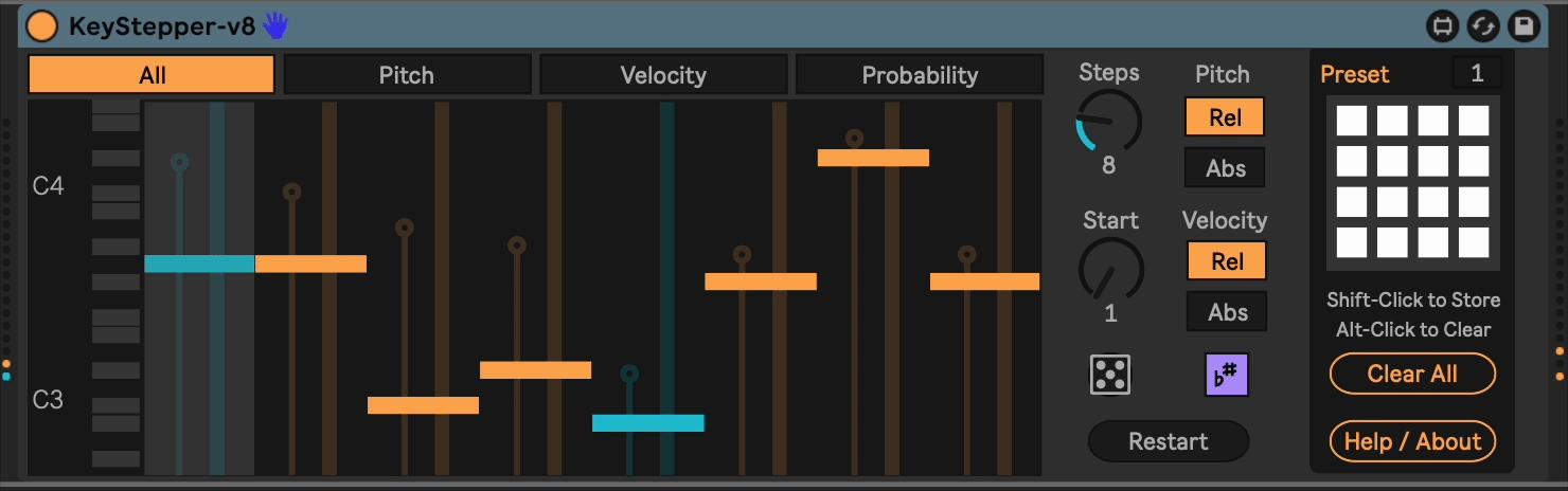 | Description: | This is a step sequencer (1-32 steps) that advances on note-on events. This gives you the ability to easily create polyrhythms and interesting time-shifting variations. Each step can hold a pitch (relative or absolute), velocity, and note probability. This allows you to really go hog on generative music. More at: https://plugins.steinkamp.us/m4l-KeyStepper Now with Scale Awareness, Randomize function, and Velocity modes. See my other free, open source devices here: https://plugins.steinkamp.us/ |