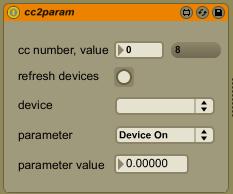 | Description: | Converts MIDI cc messages to a device parameter of your choice. Converts cc range (0 - 127) to parameter range automatically. Instructions: type in the cc number, refresh the device list, choose device and parameter. I made this for my own use because I couldn't find anything else that did exactly what I wanted. Its purpose is to allow cc messages that are generated from within Live (from MIDI files, automation or generator devices) to control device parameters. It is very basic and doesn't follow ay of the Max for Live production guidelines, but hopefully it will be useful to others. |