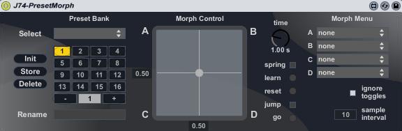 | Description: | MorphJ is the free device in the J74 Morph device family. This free plugin allows you to interpolate any two Ableton Live parameters in a X-Y fashion. The X-Y handle can be also physically controlled using USB devices supporting the HID (Human Interface Device) protocol such as Gamepads, Joysticks, Pen Tablets, 3D Gloves, Wiimotes, and so on. Here a two minutes Youtube video over the MorphJ Free device: http://www.youtube.com/watch?v=5Zh-EPiwwq4&list=PL3EE9E63D763DDCDA&index=1&feature=plcp ###################### The J74 Morph device family is a set of Max for Live devices which allows you to morph (interpolate values) across shapshots of track settings, device presets, mixer sends and device parameters. The full Morph set includes also some eccentric, but highly useful, tool for animating and modulating your Liveset, such as a 2-dimensional geometric LFO, a XY envelope looper, an LFO envelope generator and support for XY-control from USB devices like Gamepads, Joysticks, Gloves and so on. J74 Morph devices can be loaded in any track (appearing to Live as transparent audio effects). For more info visit: http://www.fabriziopoce.com/morph.html |