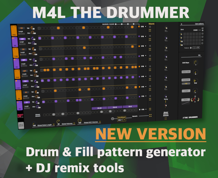 | Description: | M4L THE DRUMER is an instinctive & creative Midi Step Sequencer for Generic/Experimental MUSIC. __Get the DEMO version straigth below __Get the PRO version on our website SMAOLAB.ORG NEW VERSION 2.6 // 9th December 2025 - CHAIN up to 192 steps ! - Map patterns on a midi controller & RECALL them with ease ! - Probability sequence – CHANCE – - Remix (150+ remix patterns) - Trig each track/note - New user interface This step sequencer proposes: - 8 tracks (polyphonic) - Huge User Interface - Pattern & fill generator algorithm, - DJ effects - 8 Individual Roger Linn Swing functions - And many more features ! Better than words, we propose you to test the plug in and tell us what you think : a DEMO is available below. The DEMO version - 2.5 not 2.6 - is fully functional, but the plugin pauses every 5 minutes & resumes automatically after 5 to 10 seconds. More info at : https://smaolab.org We hope you will enjoy as we did to develop and use it ! |