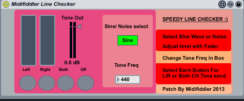 | Description: | Update to V1 Quickly send tone to audio outs for line check purposes, can be individually routed. V2 -I've added some OSC controls and uploaded a template to Lemur Template Library (http://liine.net/en/community/user-library/) so you can remote control the patch (kind of handy if your laptops are off stage whilst you are on stage doing a line check!) Any suggestions/feedback welcome ref this device, my M4L prog knowledge is limited so there may well be more efficient ways of programming this patch ... if so I'd love to know! cheers |