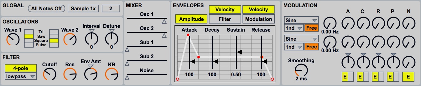 | Description: | Mine of Minus is a polyphonic subtractive synth with lots of modulation options. Well worth a look for bass sounds, melody sounds as well abstract textures of many kinds. It's built entirely with standard Max objects and should work with all versions of Max and Live. There are mouseover hints and annotations for the various controls, but leave a comment if you've any queries. There's a video with a few examples at: https://www.youtube.com/watch?v=inqmQKFjLpo Enjoy! |