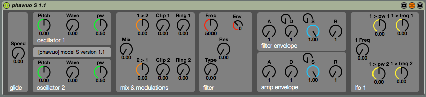 Phawuo is a monophonic Maxforlive synthesizer with special dirty yet antialiased oscilators and nonlinear 24dB/octave filter.
