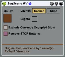 | Description: | UPDATED in v1.1: New Relative/Absolute control for Scene launching. When in Relative mode, the key input will be ADDED to the existing scene ID. Also, Ableton will keep the sequencer scene selected at all times for complete hands-off usage :) The Clips mode is left unaffected. --------------- Based on 12RT2's Sequenscene v1.1: http://www.maxforlive.com/library/device.php?id=1984 Make sequence of scenes (or clips on a specific track) using midi clips. Check out the original Sequenscene device page for detailed instructions. ----------------- The RANDOMIZER Function: "RV" stands here for Random by Velocity: enter a chord (up to 6 simultaneous notes) and the device will trigger ONE of the respective scenes randomly, weighted by each note's velocity. e.g. you may have the following chord / corresponding scenes: C-2 vel 30 ..... scene 1 prob 30% C#-2 vel 30 ... scene 2 prob 30% D-2 vel 40 ..... scene 3 prob 40% Note: the original Sequenscene's velocity mapping function has been removed |