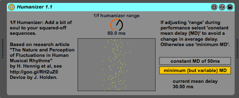 | Description: | THIS DEVICE HAS BEEN SUPERSEDED BY THE GROUP HUMANIZER, WHICH CAN HUMANIZE MULTIPLE CHANNELS, KEEPING THEIR VARIATIONS CORRELATED, IN A REALISTIC MANNER. WE RECOMMEND YOU DOWNLOAD THAT ONE INSTEAD: http://www.maxforlive.com/library/device/2466/group-humanizer --------------------------------------------------------------- 1/f Humanizer: Add a bit of soul to your squared-off sequences Summary: Each incoming MIDI note is delayed a random amount of time. The delays that humans produce when playing music are not purely random but are correlated and can be described by colored noise (for example 1/f noise, also called pink noise). The 1/f Humanizer thus imitates the human type of delays. Based on the research article by Holger Hennig et al, "The Nature and Perception of Fluctuations in Human Musical Rhythms", PLoS ONE 6:e26457 (2011). Free article download at www.plosone.org/article/info%3Adoi%2F10.1371%2Fjournal.pone.0026457 Max for Live implementation free for private use, written by James Holden. Technical description: For each incoming MIDI note (a list composed of one pitch and one velocity), the trigger object first asks a random object (pink~) to produce a random value in response to a bang message ("b"). The random range is set by the RandDel dial. The random value is then interpreted as delay time by the pipe object. New in Version 1.1: - window added, that shows the delays - new switch between two modes: (1) "minimum (but variable) mean delay". This setting makes the humanizer respond instantly to the selected 'range'. The mean delay is half the humanizer 'range'. Note that the current mean delay changes when adjusting 'range'. Recommended as default. (2) "constant mean delay of 50 ms". Recommended when adjusting 'range' during performance. |