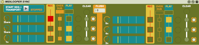 | Description: | This is a MIDI looper sync to Live Transport. There are 6 independent loops which can be REC, PLAY, OVERDUB or OVERWRITE and CLEAR. Firstly, let's remember that midi-looping is exactly what you do in Live's midi clips, it's drawing a sequence, not recording sound. The sequence is then outputed to the instrument you've placed after. Why midi-looping instead of audio-looping ? Midi datas can be changed post-looping, for example you change notes, add an arpegiator, change tempo without destroying sound, change decay or release,.. of all the sequence you've recorded. In that case, put the midi effects (like arpegiator) after the looper, if not the datas will be recorded in the looper. Furthermore, midi-looping doesn't cut release and so acts smoother than audio-looping in transition between REC or not, PLAY or not. TUTORIAL Choose a lenght for your loop. I suggest first to active overdub, rec and play to understand it right. Press Live's PLAY or the START SEQ + TRANSPORT (Live will automatically play) (If the transport is stopped, nothing can play or record) (I suggest having a clip playing to ear the current tempo of the live set but you can also use a metronome in the phone. You can also rec a quick simple short loop) Start playing notes, they are recorded and start playing in loop at the end of the choosen lenght. A white led let you have a visual feedback of what you've recorded in each loop. The PLAY toggle act like a MUTE, you cut the output but the recorded sequence is still running. The playback starts at the beginning of a note, so if you PLAY just after the beginning of a long recorded note, it won't be heard and the play back will start at the next recorded note. I suggest always thinking "just before" when you active play, your playings will always be clean. Unactive overdub will overwrite the recorded sequence if you don't REC OFF. So if you record during 1 bar and let the REC ON without playing, all the sequence will be erased after one another bar. You can CLEAR (as toggle PLAY and OVERDUB) individually each loop or by column of 3 loops. Changing loop lenght during the playback gives good results, changing the speed of playing of the entire sequence without changing sound. It can act like a sync roll and when you come back to original lenght, all the notes stay synced and in its right place. To avoid held notes because of midi datas, the device flushes (sends All Notes Off) each time you REC or PLAY. This maybe working good but if you've got held notes (non-zero resting in the Flush column), you can flush manually. LIMITATION I couldn't prevent the device to start automatically the transport when you open your Live project, so i made it stop a bit later. Enjoy and share ! |