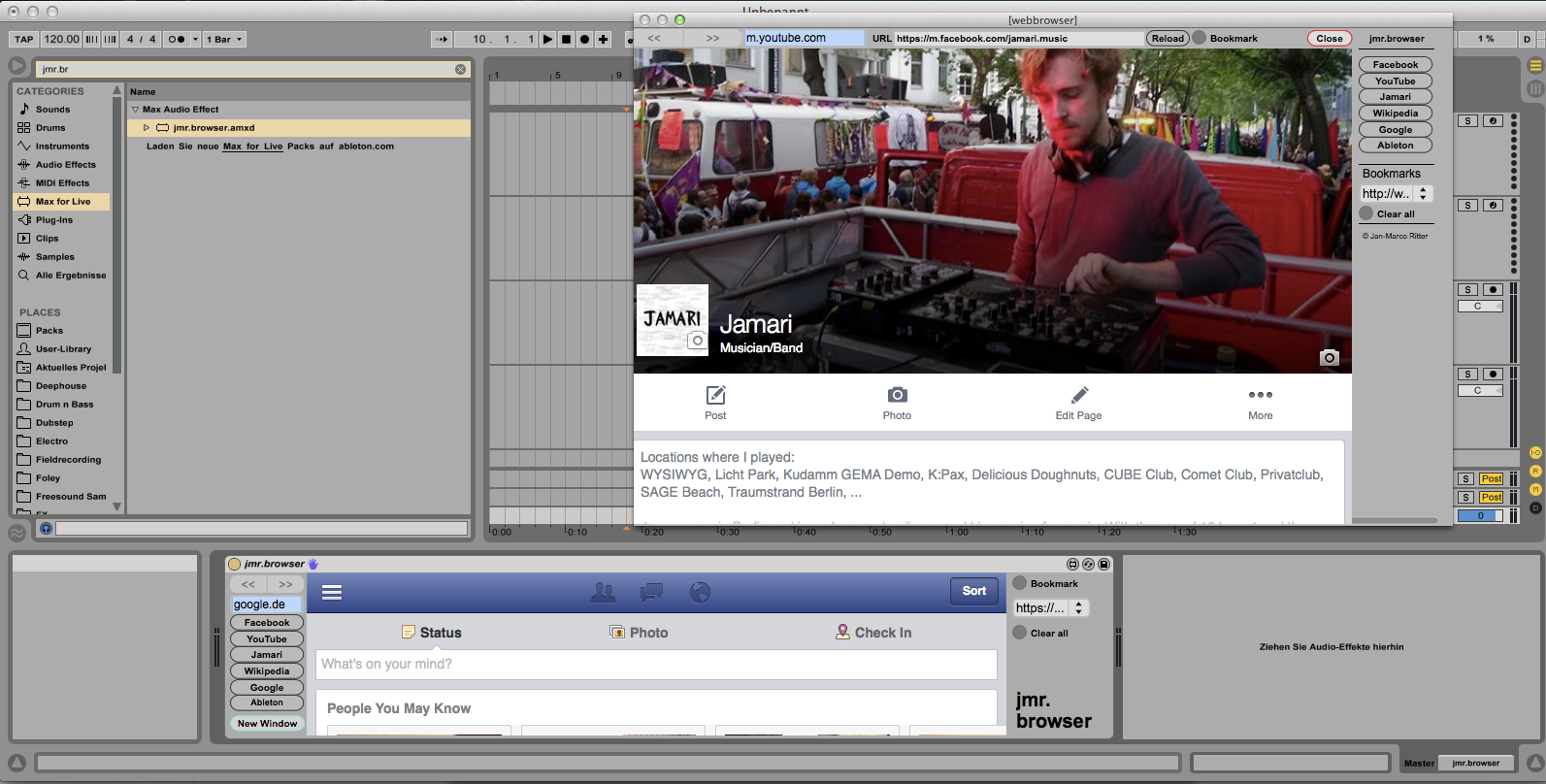 | Description: | Ever wanted to use Max for Live as a Webbrowser? Cause now you can! Based on Max's "jweb" object integrated into a m4l device with useful controls. It is very straight forward and self-explanatory. It is made in an audiodevice so you can put it on any kind of track in live. The audio doesn't get modified and gets direct through. Just put it on any track you like (for instance the master channel). Wanna check your Facebook/Twitter Stream while working on a project in Live without using a browser like Firefox? With jmr.browser this is very easy! You can even open up a floating window by clicking on "New Window" that will stay on top all the time. (as shown in the screenshot) The shortcuts to some webpages can be easily modified with some basic m4l knowledge but if you're not that good in m4l you can also easily add your own bookmarks in the bookmarks-section. I recommend using the mobile webpages with the device because they load quicker and are better to read with such little space. The shortcuts are all loading the mobile versions of the pages. If you have some ideas how to improve the device feel free to contact me! Also if you used this in any of your works it would be nice to hear about that :-) To-Do List: 1.) Make it possible to store webpages/bookmarks with sets, so you can have webpages as notes in your Live sets. 2.) Clean Up ;-) |