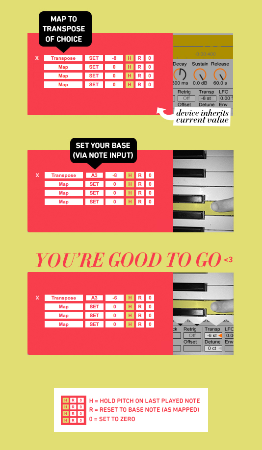 | Description: | pretty simple: i've always wanted to "play" the pitch of samples (in e.g. a drumrack) with a keyboard. this device allows it. 1) place on *own* midi track and set your input (e.g. for your keyboard) 2) map to transposition parameter (of e.g. drumrack) 3) set your base note (which equals the current transposition value) 4) play it. try an arpeggiator etc - it's fun! features: - when first mapped, automat uses your current parameter/pot values. - allows 3 different note-off settings (see image) - intuitive key control - works throughout your set |