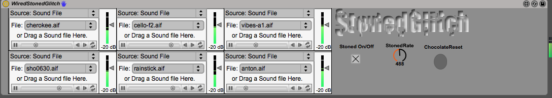 Description: StonedGlitch is a glitch patch which allows the user to glitch through six different audio sources. Each source can triggered by Ableton Live piano roll [C3-G3]. The user can adjust the final result by changing the output between 5 different effects, these effects can be triggered by Ableton Live piano roll [C4-E4]. This glitch patch has an extra feature, the user can enable the “stoned mode” and adjust the rate. This mode randomize the parameters values of the effects, the rate adjusts the time of randomization.The “chocolate reset” button initializes the parameters values.