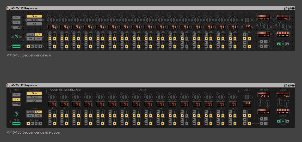 | Description: | Ciao, this is a modification of the "ML-185 Stage Controlled Sequencer" originally made by Nico Starke. (http://www.maxforlive.com/library/device/75/ml-185-stage-controlled-sequencer) Please comment if you have problems/bugs. Changelog: Version 1.5 - New interface and graphics - Improved randomize section - Select between two skins - Minimize button to scale the width of the device to save space - Set global play mode Version 1.0.1 - Fixed a bug where the note duration is longer then a tick, especially on 1/32 and 1/16 timing. The note duration now depends on timing. Version 1.0 - On/Off-Button - MIDI-Through on main interface - Save and load presets which will be stored into the Live project - 1/4 Timing - 16 Knob Stages - Randomize and Clear for all settings (excluding division) - You can adjust the range for randomizing - Switch between semitones and MIDI-notes - New Interface Bugs to be fixed: - Division number doesn't change when inactive Download previous version: http://kapetan.net/mk16/downloads/MK16-185%20Sequencer%201.0.1.amxd |