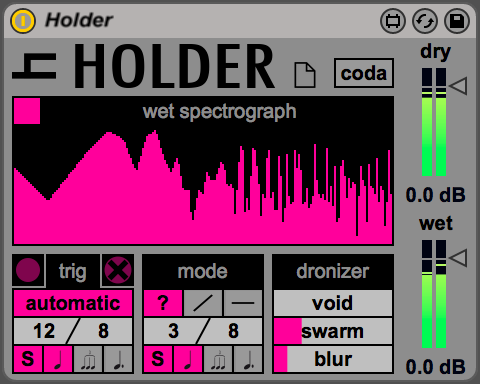 | Description: | FREEZE. EDIT. EVOLVE. Holder is a spectral freezer effect based on FFT analysis and a video engine. It retains small portions of sound, and creates rich textures, organic drones, and many more with. You can use Holder with any kind of sound: acoustic instruments, drum loops, synth phrases and vocals too. You'll be surprised at any time about its incredible sound quality and flexibility in producing so different results. Its main job is to transform any sound in beautiful sustained tones and drones, but it may be even used as a reverb (it produces unusual morphing shadows for your sounds), as a live counterpoints producer (as well known stomp boxes), and to enrich grooves with rhythm-based madness. The video engine is used to traduce stored sound in video content, then it applies exclusive effects via the dronizer panel, to shape your drones in detail. Holder is a friendly device, with simple user interface, giving monster results! You will fall in love with it! Sound design by Ivo Ivanov of Glitchmachines, Hyena, and K-Devices. |