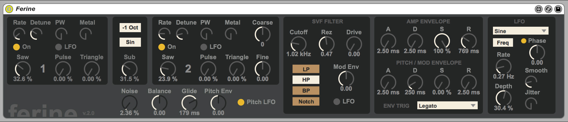 | Description: | Ferine is a fairly extensive rework of the microbruto synthesizer by modlfo: http://www.maxforlive.com/library/device/2276/microbruto June 27, 2015 - Solved the buffer-filling-up issue. June 25, 2015 - This device has been updated to solve the issue with internal patch routing affecting multiple devices. Ferine is a monophonic, dual oscillator synthesizer, based on the architecture of the Mini/Microbrute synthesizers. Each oscillator contains a saw, square, and triangle wave. The saw is now more closely modeled after the minibrute, with detune and rate adjustments. The square, pulsewave adjustment, and the triangle has a "metalizer" adjustment. There is now a single sub oscillator, and noise adjustment. Pitch glide/portamento has been added, and the pitch envelope can be assigned positively or negatively. At full strength, the envelope will travel one octave. The envelope section has seen some updates - Legato, Retrigger, and Last-Note triggering are available. The setting applies to both envelopes. The envelope/gate triggering has been removed in favor of this. The synth is also responds to velocity as well. The LFO section is completely new. A number of waveforms are available to select from, the LFO can be rate or tempo synced (right now, Live has to be running to sync to clock - I'll see what I can do about this), phase adjustments, and smooth & jitter modulations can be applied. There was some sloppy note-taking on my behalf when I did this - I believe some of the routings/setup of this came from one of Robert Henke's early LFO devices. So, kudos to him and everyone else in the M4L community for doing some of that heavy lifting. The mod matrix, as it existed, no longer exists. Pitch or filter can be modulated by the second envelope, and that's it. The utility (and effect) of assigning the saw, pulsewidth, or metalizer settings to it were minimal. Pitch, pulsewidth, and the filter can be modulated by the LFO. I removed the saw modulation, as the sawtooth oscillator saw some significant changes. It essentially has it's own LFO (two, really) internally. Modulation for the metalizer effect was removed, mainly due to the fact that it didn't sound good when modulated. There's a fairly drastic change that occurs midway through the adjustment. I may update it to more closely reflect the minibrute. So, there you have it. Enjoy, and thanks for all the downloads thus far. |