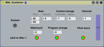 | Description: | This is a simple MIDI effect that converts CC64 (sustain pedal) into note duration on the fly. It is intended to solve a couple problems with Live's MIDI implementation, namely that (1) when the transport stops, notes held by the sustain pedal are not released, and (2) CC64 messages are difficult to deal with in the piano roll editor, e.g., they aren't moved by the quantize / groove / stretch commands. The device removes all CC64 messages from the incoming MIDI stream, produces a MIDI output stream with note durations that reflect the sustain pedal movements, and sends note-off for pending notes when the transport stops. It also optionally filters out channel pressure, pitch bend, and program change messages (red box = filtered; green == unfiltered; click to toggle). Finally it displays (white boxes) the MIDI messages it receives. It's intended to be used "upstream" of a record-armed MIDI track, so that CC64 events never reach the MIDI clips. For example, put this in a MIDI track fed by keyboard controllers, and select this track as an input for tracks that you're recording using the sustain pedal. It can also be used "downstream" of a MIDI clip that contains CC64 events, simply to fix the problem of hanging notes when the transport stops. (updated to treat extended pitch bend messages.) (updated to fix bug in CC event timing.) (updated once more to work around a bug in the M4L observer code whereby a spurious 'STOP' message is sent by the API 20ms after the transport is started by the user. introduced a 100ms de-bounce to work around this problem) (updated to allow the settings of the filter LEDs to be saved when the device is dragged into Live's browser) |