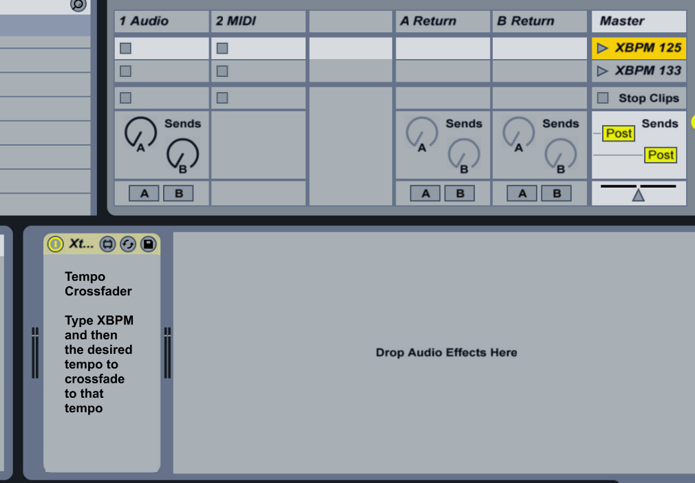 | Description: | Gradually fade between different tempos by naming your scenes appropriately - ie by launching the scene named XBPM 150 the set will gradually change tempo from your current tempo to 150 bpm. The rate at which it changes is dependent on the size of the gape between tempos - ie larger changes in tempo take longer. |