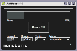 | Description: | RiffBeast generates notes and writes them to a MIDI clip. A slider changes how 'tame' or 'wild' the note patterns are. The scale and pitch range can also be set by the user. When a MIDI clip is highlighted in Live's Session view, RiffBeast overwrites any existing notes when generating a new riff. This allows RiffBeast to be used 'on the fly' to create new patterns while playing live. If no clip is selected, a new 1-bar MIDI clip is created. |
