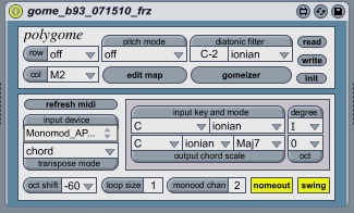 | Description: | Polygome by Stretta. Check the original docs if you want to know what this does. http://docs.monome.org/doku.php?id=app:polygome This device is a modular plugin for Monomod. It requires that plugin as a host, as well as a Launchpad or iPad with TouchOSC, to work. I've adapted it in many ways for use in m4l. You can run multiple instances, it will remember its saved states and store presets, and each individual part will display on the control surface as a different color. There are two hold buttons now, instead of one, for ease of use on an 8x8 grid (I wil probably add the other two bottom corners in future versions). I have removed a lot of functionality from the original version. This patch has been ported around so many times within my setup (its a pre m4l port for me) that I really don't even remember all the things that I've done to it. Modes on the top left of launchpad are 1=play, 2=record, 3=duration, 4=velocity/step. Presets should work fine if you load them and save them from the plugin window, but really, you should just save the device using Live's preset manager. It works just as well. I haven't been using this much lately, so please let me know about bugs. I know there must be some. b93 @ 071510: updated GUI, added new timing engine, swing bypass, modified preset storage. b94 @ 090610: fixed a couple of default settings that were probably tripping people up (like loop count defaulting to 1). Added compatibility for monomodular_b94 and autodetection, etc. |