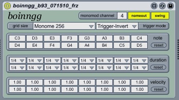 | Description: | Boinngg by pixelmechanic. Original info: http://docs.monome.org/doku.php?id=app:boiingg monomod: http://www.maxforlive.com/library/device.php?id=310 Adapted for use with Monomod. Its pretty straight forward. I didn't spend a lot of time porting this from the last project, so let me know if anything doesn't work as expected. I'll add multicolor if I can ever figure out a way that the patch would benefit. Basically, this is just a tribute to bouncy polyrhythmic goodness :) b93 @ 071510: updated GUI, added new timing engine, swing bypass, modified preset storage. b94 @ 090610: updated to add compatibility to monomod_b94. |