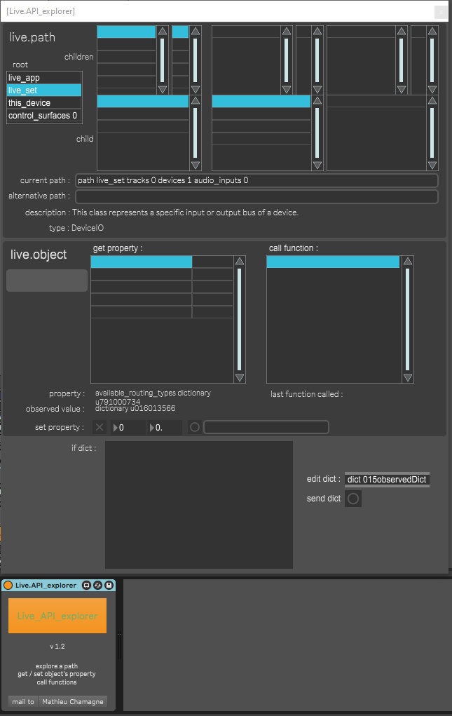 | Description: | browse the live.API path, get & set properties + call function of all objects & parameters in a live project. |