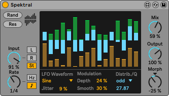 | Description: | Spektral is a dual 16 channel bandpass filter based spectral processor. You can morph between the two filters, the LFO, controlling the morphing is synced to Live. https://www.youtube.com/watch?v=CMFEcrrcBf0 Version History : 3.o1 - Click on the device logo now shows numbers instead of sliders. 3.o2 - Updated to Live 10. (Important! If you're still using Live 9, please, stick with the old version! There are major UI changes in Live 10, these will look ugly under 9) 3.o3 - user request : full MIDI mapping 3.o4 - spectrogram added; preset save and load implemented 3.o5 - Ableton banks support added for Push 3.o6 - save/load bug-fix 3.o7 - minor UI fix 3.o8 - Shift + click on logo now opens a mail window to easier contact 4.oo - redesigned UI, LFO section, in/out section, filter section 4.o1 - UI glitch fixed, device now follows correctly the selected Live theme 4.o2 - minor tweaks 4.o3 - live.banks fix 4.o4 - Apple silicon check 4.o5 - dynamic UI 4.o6 - Live 12 compatibility check |