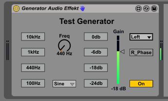| Description: | Test Generator Audio Device V1.0. Sinus, White und Pink Noise auswählbar. Schnellwahl Tasten für 4 Frequenzen. Wenn Aus, dann Bypass Aktiv. Schnellwahltasten für 4 Gain Stufen. L, L+R und R Kanal wählbar. R in Phase umkehrbar. (Auch als Instrument Device verfügbar!) |