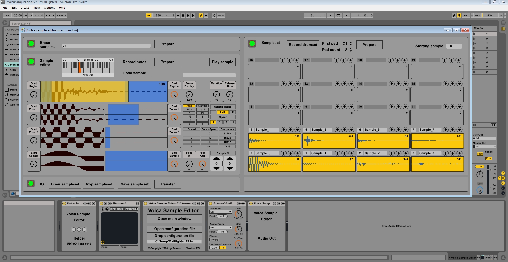 | Description: | The Volca Sample Editor is a set of MaxForLive devices that can take samples from any instrument inside Ableton Live. You can specify the start and end points and transfer it to your Volca Sample. It’s integrated into Ableton Live. There’s no other device or software involved. New in version 035: - Combining samples into a sample set - Sampling drum kits into a sample set - Saving sample sets - Transferring sample sets to the Volca Sample in one go I’ve translated the SYRO library for MaxForLive to communicate with the Volca Sample. It can be automated from any MIDI device with 16 dials and 16 buttons. A preset for a Midi Fighter Twister is included, but a cheap NanoKONTROL will also fit the bill. The Volca Sample Editor is written for MaxForLive 6. It is not tested for MaxForLive 7. |