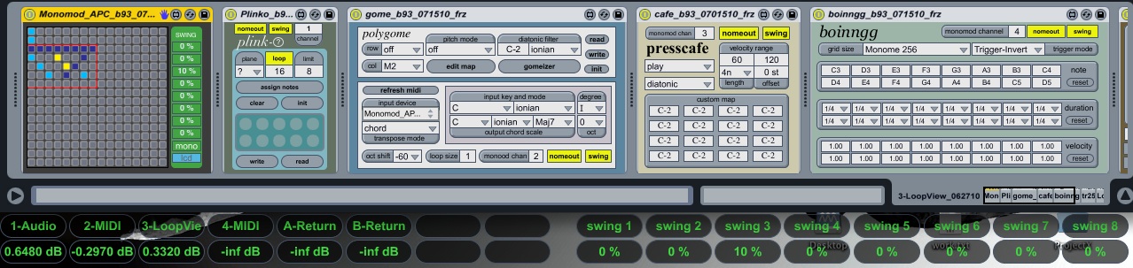 | Description: | ///This device is now contained in Monomodular...download it, as it adds a great deal of functionality, and corrects many bugs/// http://www.maxforlive.com/library/device.php?id=310 Monome emulation (8x5 or 8x8, monochrome or multicolor). HUD for use with Device Control and Faders. Requires a modified version of Hanz Petrov's APC40plus22 script, which you can download here: http://dl.dropbox.com/u/6044993/APC40_22.zip Put that in your MIDI Remote Scripts folder. It adds a lot of extra functionality, even before my additions. Details here: http://remotescripts.blogspot.com/p/support-files.html#APC40_22 I've made many new additions: Master Select toggles between Monome mode / Session mode. Shift Master Select switches between partial (5x8)/full (8x8) grid mode. In partial mode, stop buttons select plugin (p1 through p8, see below). Scene buttons 1-4 select Modes 1-4; Shift Scene 1-4 change the timing. Shift with the top row of grid buttons selects the Monomod channel to control. Shift with the second row of grid buttons changes the selected patches Nomeout channel. Arrow buttons move around the grid. Shift with arrow buttons will bank. If you label a plugin with the prefix "p1" through "p8", it will be selectable via the clipstop buttons in Grid Mode (5x8). I need to add a "refresh" button for this functionality, in the meantime, just create a new track and delete it, and the script should update. Track control knobs differ slightly from normal implementation: instead of Pan/Send1/Send2/Send3, they are Sends 1-4. Shift with "Stop all Clips" button will zero the selected send for ALL TRACKS. Mute and Record are reversed: the orientation just didn't make sense to me, and this way you can still use mute when in full Grid mode. I've retained all of Hanz's other additions, although I will probably change some things in future versions. Make sure to check out the documentation with the MIDI Remote Script. There will be a bunch of nagging little bugs for a while, I haven't had a chance to test this much. No show stoppers, though. I think everything is pretty stable. This will probably be the only version of Monomod exclusively for APC, as the next version of Monomod should contain scripts for all the devices (iPad, Launchpad, APC40) and support multiple devices at once. You might want to check out the other Monomod patches to get a better idea of how all this works, I don't have time right now to write proper instructions. Please leave feedback/bug reports either here or there: http://forum.ableton.com/viewtopic.php?f=35&t=143912&start=30 |