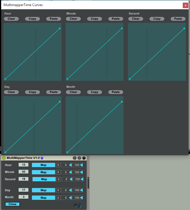 | Description: | This device lets you map a parameter in Live to time and date. Could be useful for art installations. |
