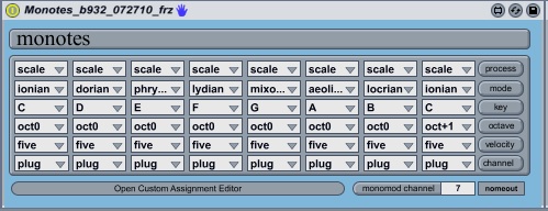 | Description: | Monotes is a simple Monomod client that allows the assignment of MIDI notes and velocities to grid buttons. It is basically nothing more than the program editor from Plinko. It only uses 64 squares of the grid, so each quadrant is identical. Presets can be saved in the usual manner. This plugin is very powerful when used in conjunction with Nomeout. It allows one to map different areas of the grid to different recieve channels in Live. I didn't spend a lot of time on this. If you find a problem or have a feature request, let me know about it. b94 @ 090610: added compatibility to Monomodular b94. |