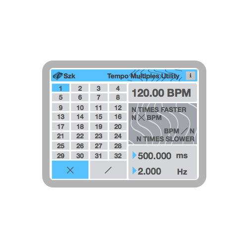 | Description: | TEMPO MULTIPLES UTILITY is a simple tool that calculates time-steps (ms) or frequencies (Hz) in function of the Ableton Live set's bpm : choose n times faster or slower and it returns you the step correspondance. Useful to help you to make choice for envelope durations, automations, oscillators sync and other lfos modulations. ______________________________________________________ All our other devices on Sellfy : https://sellfy.com/szkdevices ______________________________________________________ For more information please visit : http://m4l.szk.fr/ ______________________________________________________ |