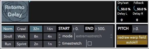 | Description: | Retorno Delay is a reverse delay based on constant (per bar) sampling into groove~ :: you can use timestretch to vary tone and timing :: you can vary the speed of the playback and you can vary the timing of playback either by beat or ms :: the sound is always evolving with the incoming audio as it is updating per bar :: don't forget to experiment with warp markers in the middle "warp field" to warp what happens within each loop to use the speed variation in playback timestretch must be OFF have fun - make it better |