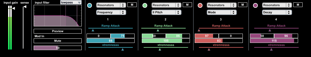 | Description: | Afterall r-chain-dm 2.0 was to lousy for updates. This is a complete makeover. Usage is still the same. Drop r-chain inside the Audio Track you want to use as modulation source. Select Device, Parameters. Make your settings. whats new? * Output values are now scaled properly. No matter if your parameter ranges from 0 - 1, 0 - 127 or 9.1231 to 123.442... r-chain knows. * "sense" slider works like a gate. if you lower the slider (sensitivity) modulation will only occur if the velocity is higher then a specific point. * input filter. use / strip out a spefific frequency range as modulation source. * "Ramp Attack" this will smooth your modulation output. Values won't change as sudden as they did before. * "xtremenesss". Adds a little more punch to the output. notes: * might be obvious but.. if you raise the ramp attack it is much likely that your modulation output wont reach its max value before new sound will retrigger the envelope. xtremness does the trick! * well i cant think of anything else right now. * Questions? Problems? Bugs? Contact me or deal with it. |