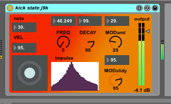 | Description: | A kick drum mad from a state variable filter in gen~ |