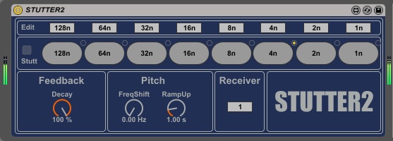 | Description: | Hi, Stutter effect Note: it's miratized 2.1: i add Stutter Sender. this allow to receive notes for trigger the stutt buttons. Put it on midi track, choose one of 8 targets, you can control up to 8 stutter2 device. And set up the corresponding receiver on stutter2. Notes are C3 to G3. Stutt Sender http://www.maxforlive.com/library/device/3801/stutter2-notes-sender 2.2 fix the issue of undo monopolized when buttons is triggered with stuttsender. 2.3 the offset with the receiver and sender is fixed. |