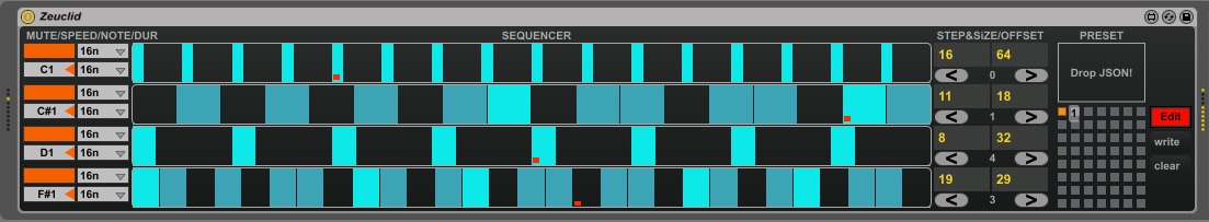 | Description: | Hello, Zeuclid is 4 euclidean step sequencers. Define size, number of steps, speed, note out and duration for eachs sequencers. The sequencer grid represent velocity. By default the value is 127 but you can customize velocity by drawing (or create/add complete sequence if you want). (note If you change size or number of step the custom value for velocity is lost.) It work little bit like an arpegiator. Any incoming note, start the sequence, a new note reset all sequencers to step 1. (if incoming note is overlapped the sequencer do not restart.) You can save presets and automatize the preset box with incoming notes (C1 to F#5). You can stop automation for example for editing, with the button Live/Edit. For the presets: Drag and drop your json file and now at each time that you reload your set the preset is loaded. (note: if you can't load json, rename it as you want with an other name and normally is done) 1.1 To prevent the monopolization of undo (when the patterns are automated with presets) all parameters are hidden. You need to use presets. |