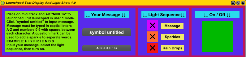| Description: | The Launchpad Text Display and Light Show is a MIDI device that can display a light show on the Novation Launchpad. Text is input by the user and converted to MIDI messages which then can be displayed along with two other light displays using a selectable light show sequence. demonstration GIF http://giphy.com/gifs/launchpad-text-display-and-light-show-3o7TKtPT9HtmpLpV8A The selectable light show displays in the light show sequence are: 1. Flashing text display 2. Random sparkling lights 3. Random falling rain drop lights with sequenced colors Steps to use this device 1. In Ableton, place the device on a blank MIDI track 2. Select “MIDI To” to the Launchpad and make sure the MIDI channel is that of the Launchpad 3. Put the Launchpad in “User 1” mode 4. Click on “symbol untitled” and type your text -Only capital letters A-Z and numbers 0-9 are acceptable -Up to 36 characters can be input -A space must be put in between each character -A question mark “?” can be used to break up words -EXAMPLE: I ? L I K E ? M U S I C 5. Under “Light Sequence” check the boxes you wish to display 6. Select the “On / Off” Box This device was made using the Launchpad Classic. I assume it would work with the Launchpad S and Launchpad Mini, but since the Launchpad Pro has more colors, it might not work with that. If you have any questions or problems please contact me or leave a comment. |