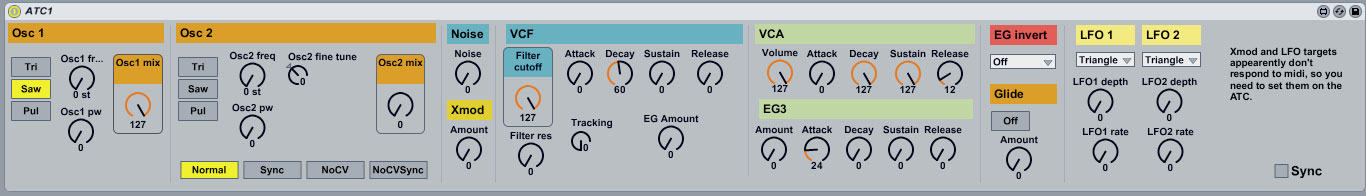| Description: | A midi plugin to control most parameters on the Studio Electronics ATC-1. I pretty much based this on delaneyparker's "FM JoMoX AiR Base 99 Control" (http://www.maxforlive.com/library/device.php?id=244). All I did was remap the CC values to match the ATC-1 and change the layout. I also found some extra CC's not mentioned in the manual in this thread on Gearslutz -> http://www.gearslutz.com/board/electronic-music-instruments-electronic-music-production/258061-studio-electronics-atc-1-editor.html Unfortunately, not all of the ATC-1's parameters are accessible via MIDI. For example, the target mappings for LFO's and Xmod need to be set on the device. Have fun! --- http://www.jackrock.dk http://www.soundcloud.com/jack-rock/ |