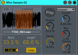 | Description: | Hi folks, Live 10 is great!!!! One of the great things is how so many of the new devices can be easily upgraded with additional circuits. I augmented the built-in "DS Sampler" with a filter (9 types, including Lowpass) after the overdrive/downsample Shaper thing (not to be confused with the other Live10 Shaper). The Resonance is flat at 1. Above 1 gives "Peaks" at the Cutoff/Center frequency and below 1 makes "Dips". I also messed around with the sample display. For example, it shows the number of milliseconds at the top. Most Importantly, it shows the name of the Sample you dropped on it!!!! Enjoy Update: I added a Play button to trigger the sample. That way, you can hear it before connecting up the midi. |