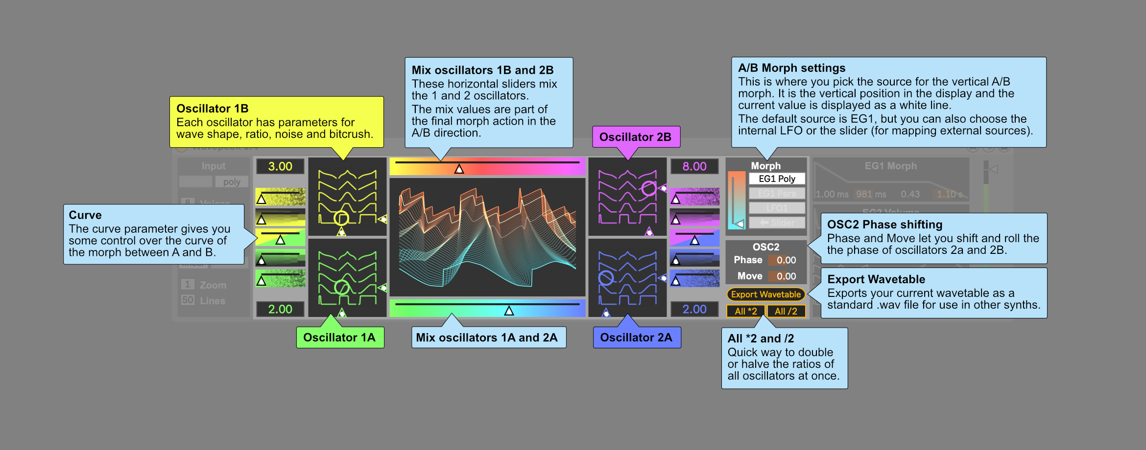 This is a great device! One possible bug - not all of the waves smoothly interpolate -- it looks like the 2nd OSC1 wave has a jump morph at the very end, whereas 2nd osc 2 wave morphs fine from either first wave of osc 1 or first wave of osc 2.