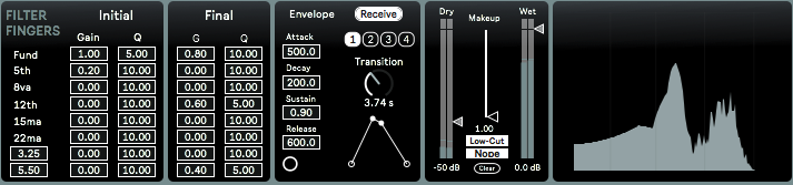 | Description: | Filter Fingers is essentially a series of MIDI-controller peak notch filters that you can "play" like a synth. This is the product of afternoon curiosity to implement into something bigger I'm working on, but it's kind of interesting as-is, so I thought I'd share it. NOTE: To use this, you will need to have the Max MIDI Sender.amxd from the Max Pitch and Time Machines pack on Ableton's site. WHAT DOES IT EVEN DO? In short, Filter Fingers is a polyphonic filtering gate. It outputs filtered frequencies based on midi note inputs. Filter Fingers has eight peak notch filters that are activated by MIDI notes. The first six frequencies are already set (the fundamental pitch of the midi note, followed by a fifth above, an octave, an octave plus a fifth, two octaves, and three octaves), plus two more below that you can set as a multiple of the incoming midi frequency. There is also a Q for each filter to set how wide/narrow you want each filter. There are two sets of these filters: the "Initial" set and the "Destination" set. This is because the filters will slowly do a crossfade to the second set over the duration of time specified by the "Transition" knob. So, for example, if you want to start with only the fundamental frequency of the MIDI note audible (with the Fund Gain at 1.0 and the Q at 25.0, and all the other gain settings at 0.0) and slowly fade some harmonics in, you can set the gain up on some of the "Destination" filters, and set in a transition time of a couple seconds to create a linear fade where those filters slowly ramp up in gain. There is also an ADSR for the filters to eliminate clicks and create a fade in/fade out for each "note." Because these filters are polyphonic, you can play multiple notes, and each note will trigger a set of filters based on the pitch of the Midi note you are playing. The function graph near the envelope settings is just to visually illustrate the ADSR envelope. The final window shows the wet and dry gain levels, with a slider between them which just serves as a sort of post-filter makeup gain slider. I added a low cut filter option in case you're using a qide ! on the fundamental pitch and want to avoid frequencies below the note. There's also a "Scope" button below that, just in case you want to get a crude sense of what the filters are up to. The "Clear" button at the bottom sends a midi flush and poly clear message in case you find yourself dealing with hanging notes. HOW DO I SEND IT MIDI? Yeah, this was what I didn't think about when I was making it. Because it's an audio effect, it doesn't take midi directly. Luckily, if you've ever downloaded the M4L Pitch and Time Machines (https://www.ableton.com/en/packs/max-7-pitch-and-time-machines/), you may have noticed a device called "Max MIDI Sender.amxd" in the set of devices. With this, you can reroute midi signals in Ableton by sending the signal to a certain Bus address. I used the scripting from that to allow Filter Fingers to take MIDI info from the first four busses on that device. Here's what you need to do: Create a MIDI track and add the Max MIDI Sender to the track. Turn on "Send" and select a Bus from 1-4 on the M4L MIDI Sender device. Then put Filter Fingers in an audio track and turn on the "Receive" button and select same number Bus you're using from the MIDI Sender device. Now Midi notes sent to the Max MIDI Sender channel will trigger the filters in the Filter Fingers device. (It's not as complicated as it sounds, trust me.) You may have to designate a MIDI source in the MIDI channel with the Send device in it, and then turn monitoring on, depending on your workflow. Then play some notes or set up a midi clip of notes in said MIDI channel to send the frequencies to Filter Fingers device in whatever track it's in. Then, you know, get weird with it and see what happens. WHATEVER: I don't know if anyone will even try it out, but if you like it or have questions, feel free to email (deets in my profile) me and I'll try to respond. This will likely be an indefinite beta, but if someone wants to suggest specific ways of cleaning up the code, maybe I'll come back to it. P.S. Oh, and sorry for the crappy YouTube vid. I just wanted to put up a quick demonstration of how it works with something simple like white noise. |